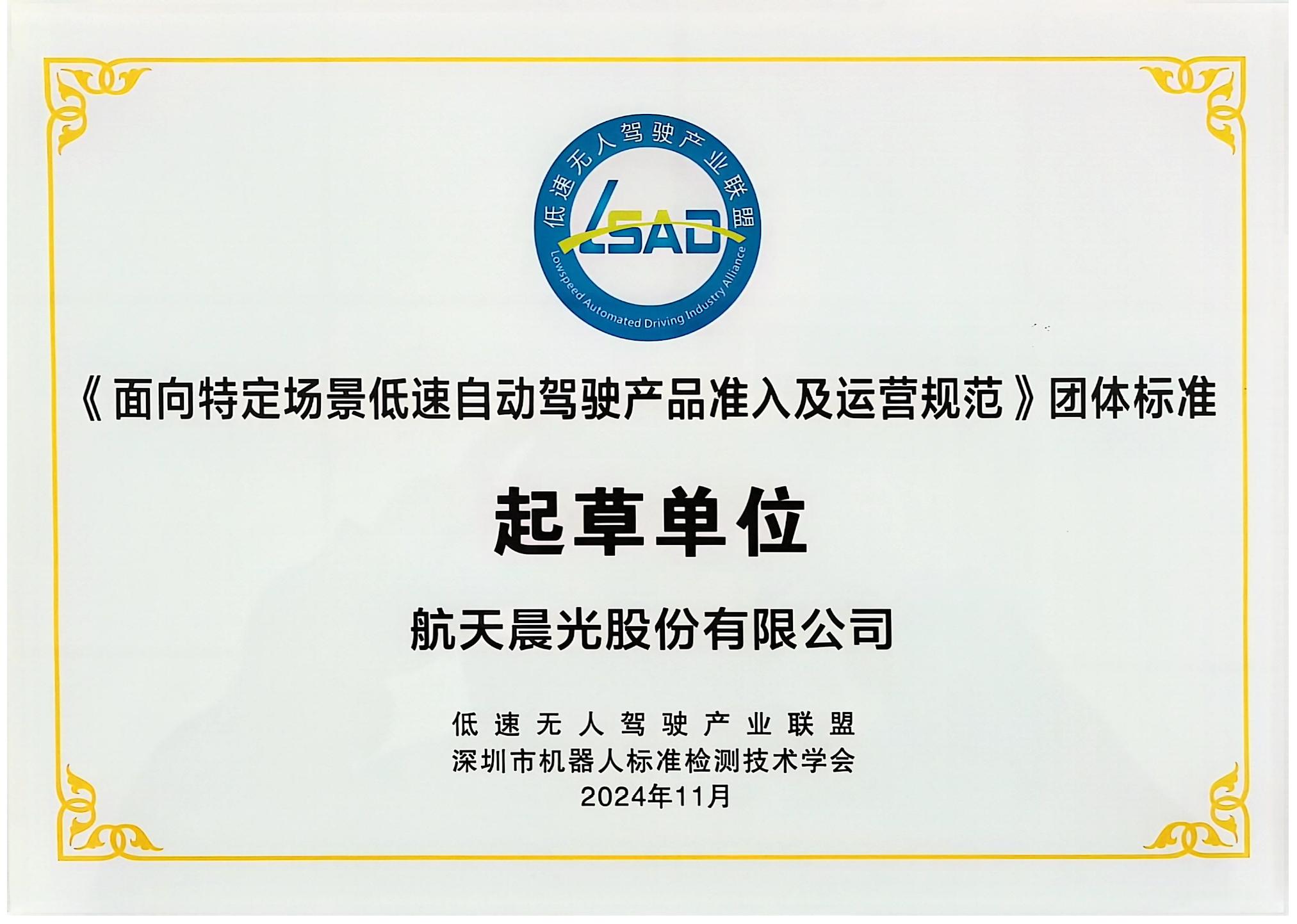 近日,在威海盛大召開(kāi)的2024(第四屆)低速無(wú)人駕駛行業(yè)發(fā)展年會(huì)暨中韓(威海)低速無(wú)人車及移動(dòng)機(jī)器人應(yīng)用發(fā)展大會(huì)上,航天晨光作為深耕高端裝備制造領(lǐng)域、積極開(kāi)拓低速無(wú)人駕駛賽道的先鋒力量,憑借深厚技術(shù)積淀與卓越行業(yè)影響力,與眾多行業(yè)領(lǐng)頭企業(yè)精彩登臺(tái)發(fā)布《面向特定場(chǎng)景低速自動(dòng)駕駛產(chǎn)品準(zhǔn)入及運(yùn)營(yíng)要求》團(tuán)體標(biāo)準(zhǔn),為產(chǎn)業(yè)規(guī)范化、高質(zhì)量發(fā)展注入強(qiáng)勁動(dòng)力。